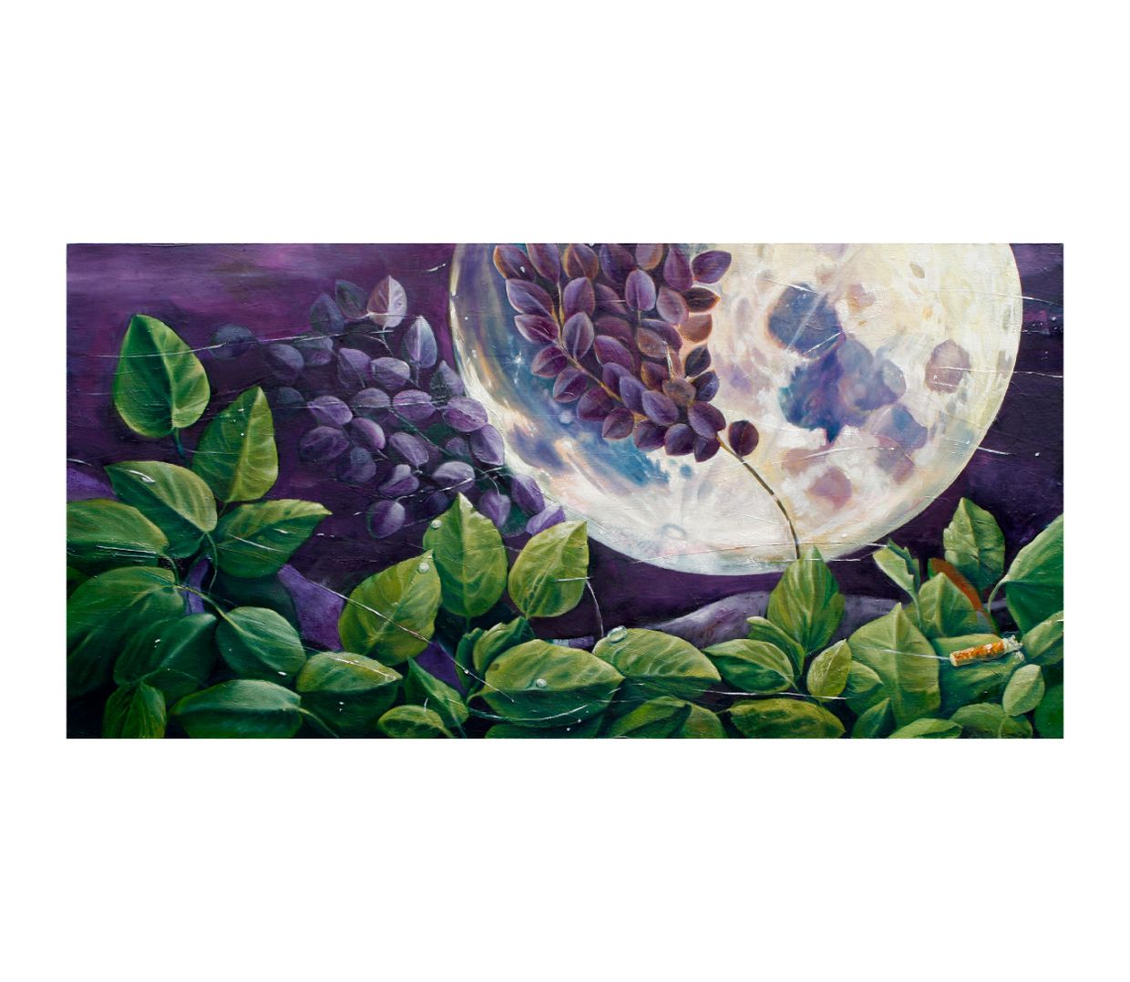 Brighter than the Moon is an oil painting on wooden panel that explores the tension between natural order and human presence under conditions of uncertainty. The composition is anchored by an exaggerated full moon in the background, a familiar celestial body rendered monumental, almost overwhelming. In contrast, the foreground is filled with dense green leaves symbols of life, growth, and immediacy brought into sharp visibility through an additional, ambiguous light source originating from the viewer’s position.
